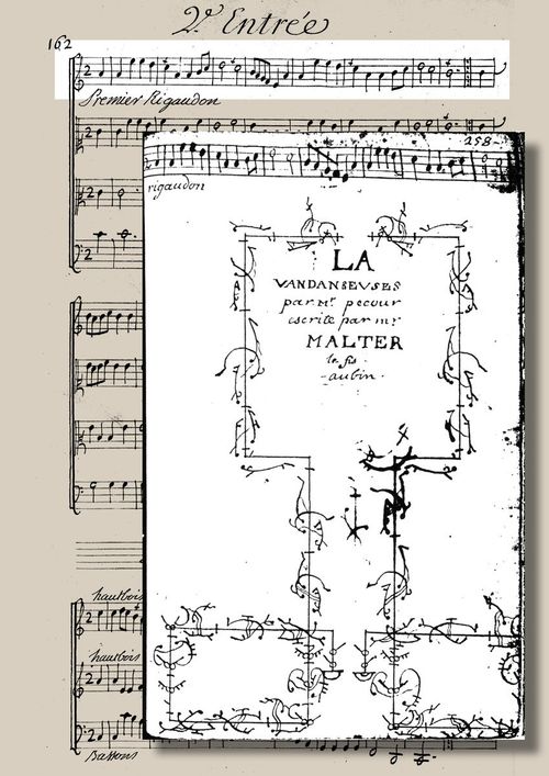 Музыка сценических танцев в стиле барокко была разработана путем объединения мелодии над танцами с другими голосами оперных партитур. Это показалось нам важным, потому что в танцах использовался другой ритм и изменение знака (в нашем примере многие «си» обозначают хныканье), что, однако, поддерживает хореографию. В данном примере шляпа снимается во время хныканья ...